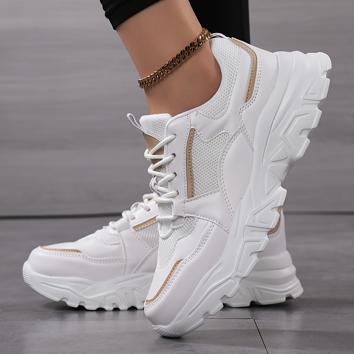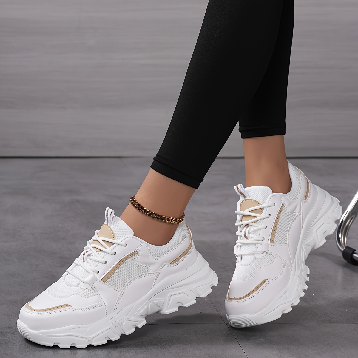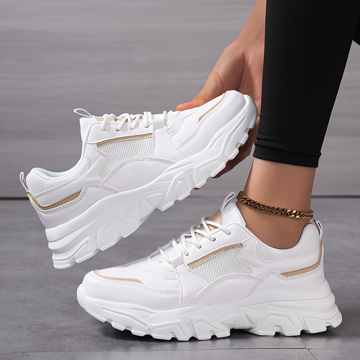 Tênis casuais elegantes para mulher em branco com detalhes dourados - Tecido de