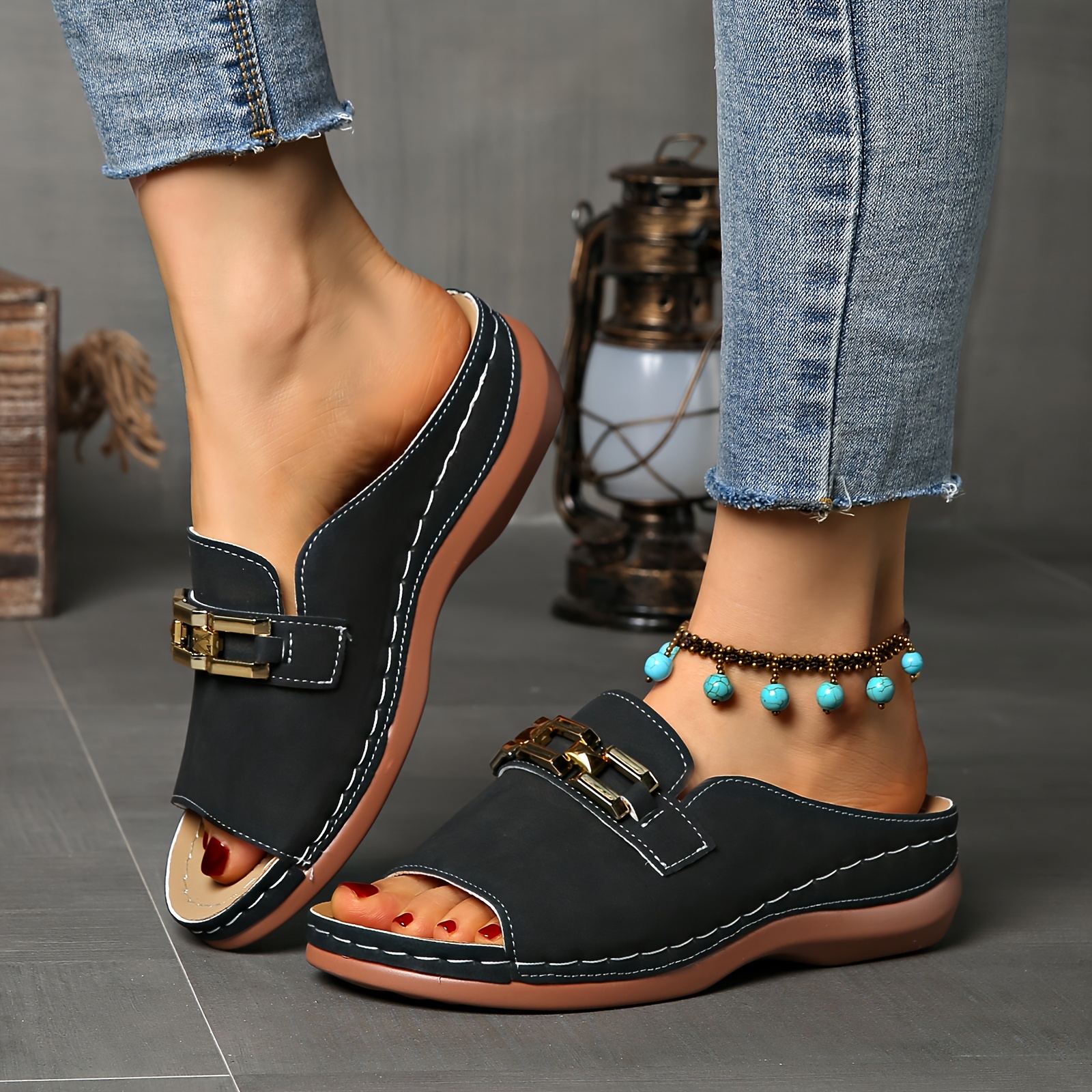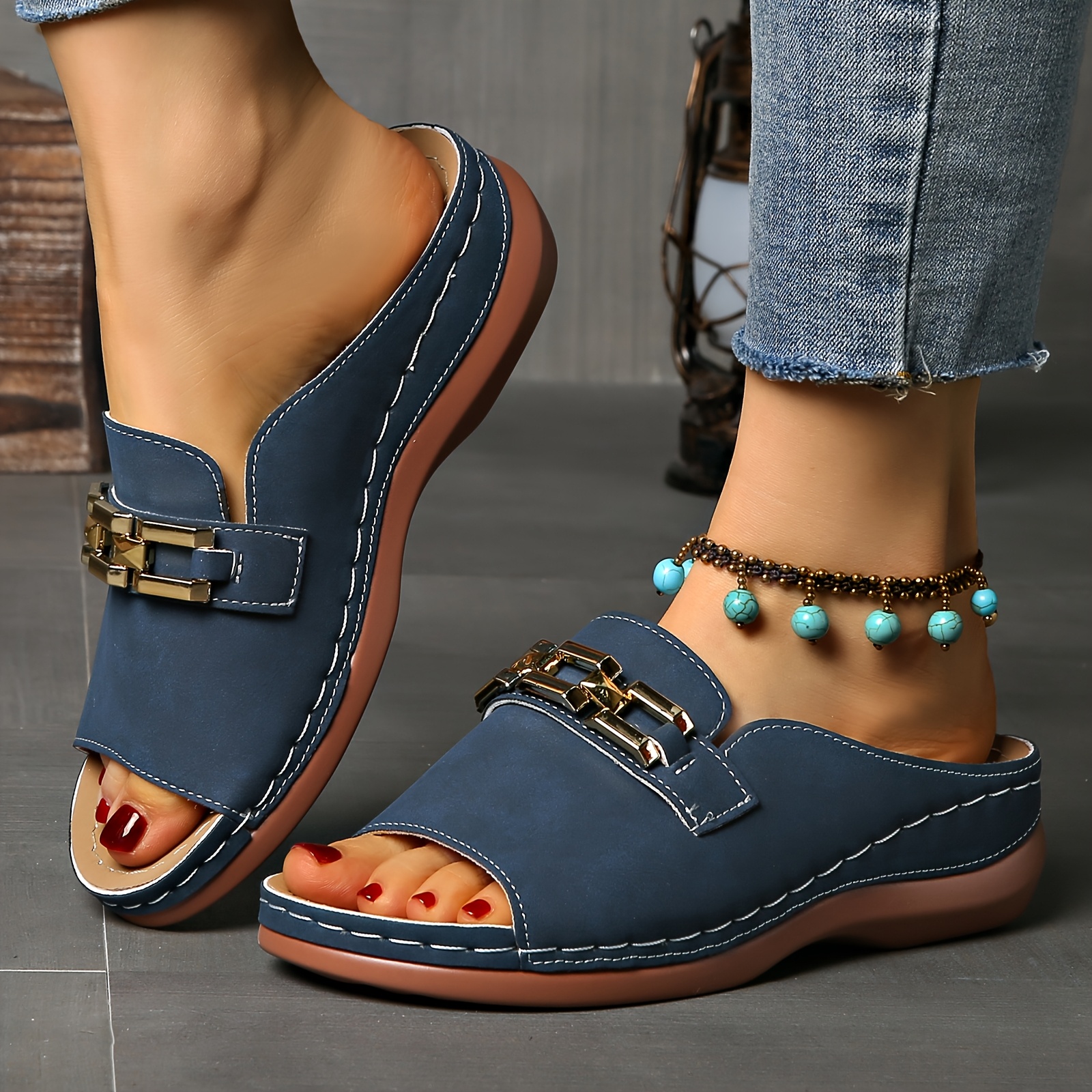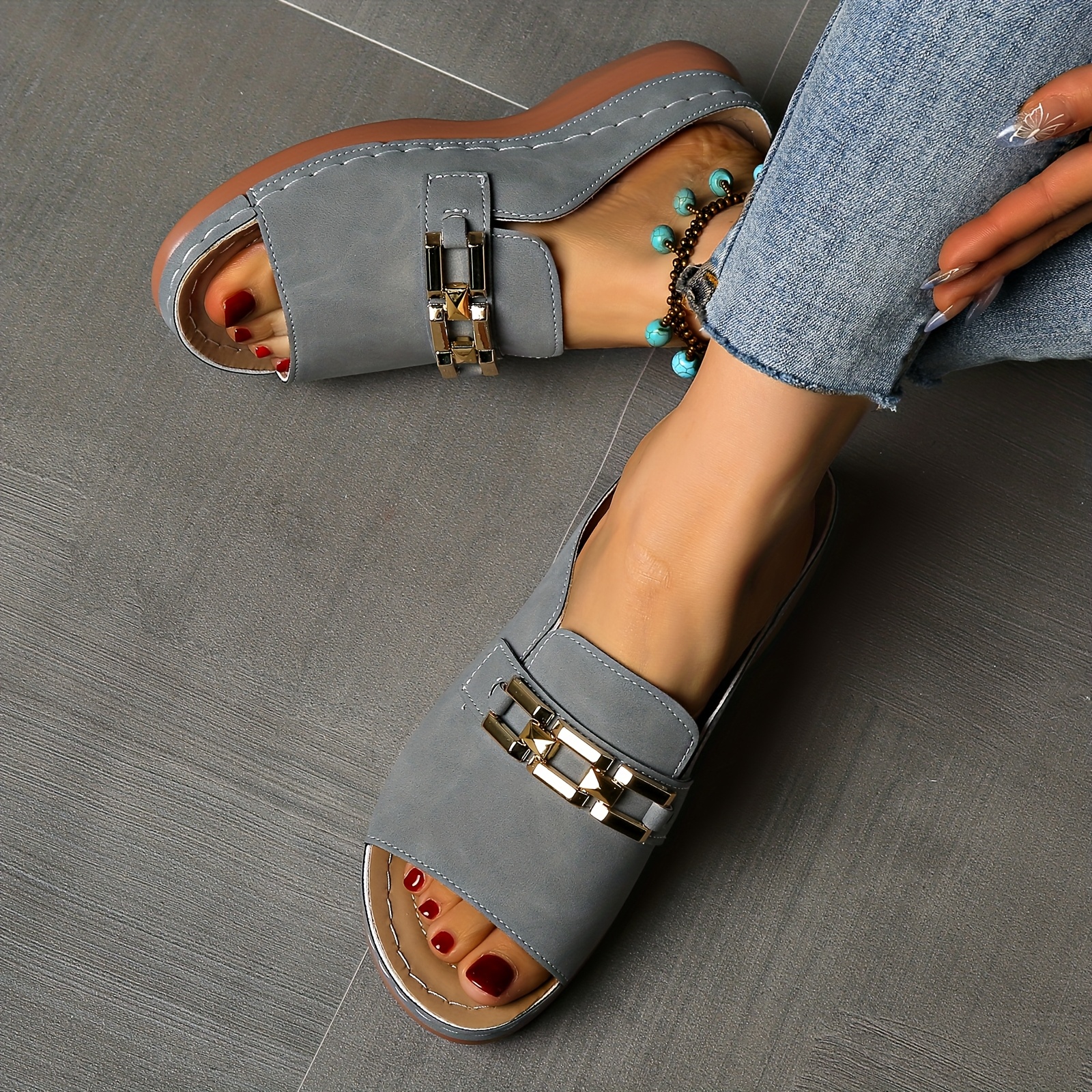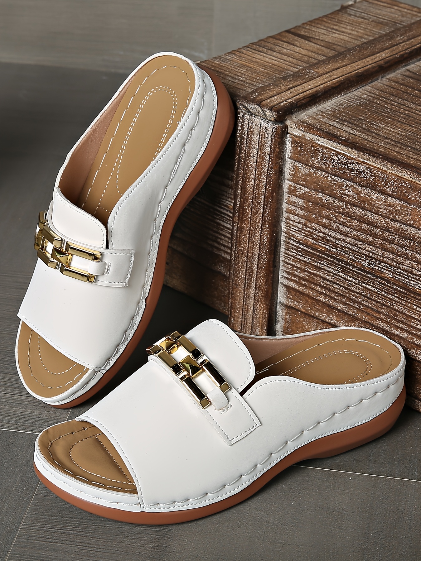 Sandálias femininas de verão com apoio para o arco - fivela dourada, biqueira ab