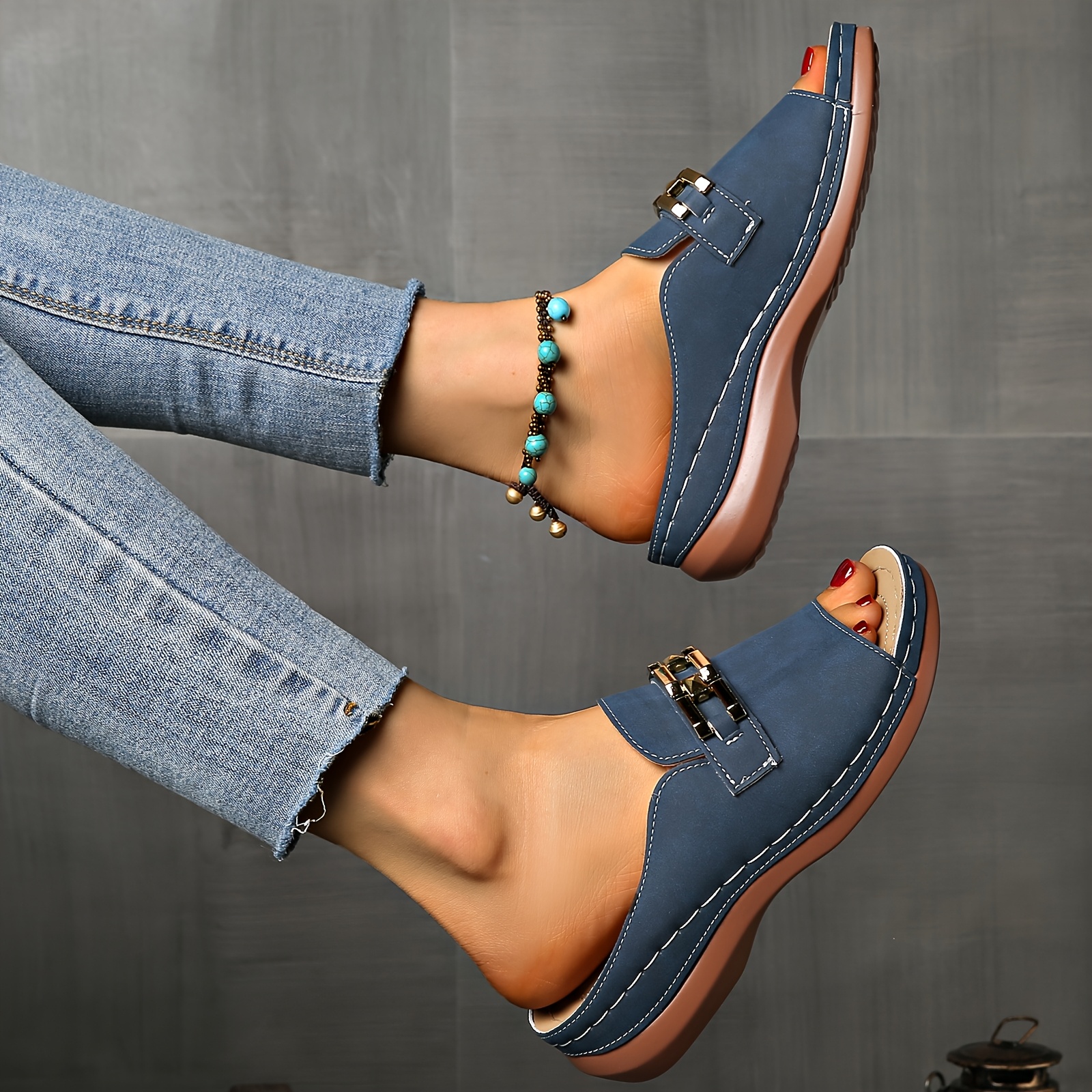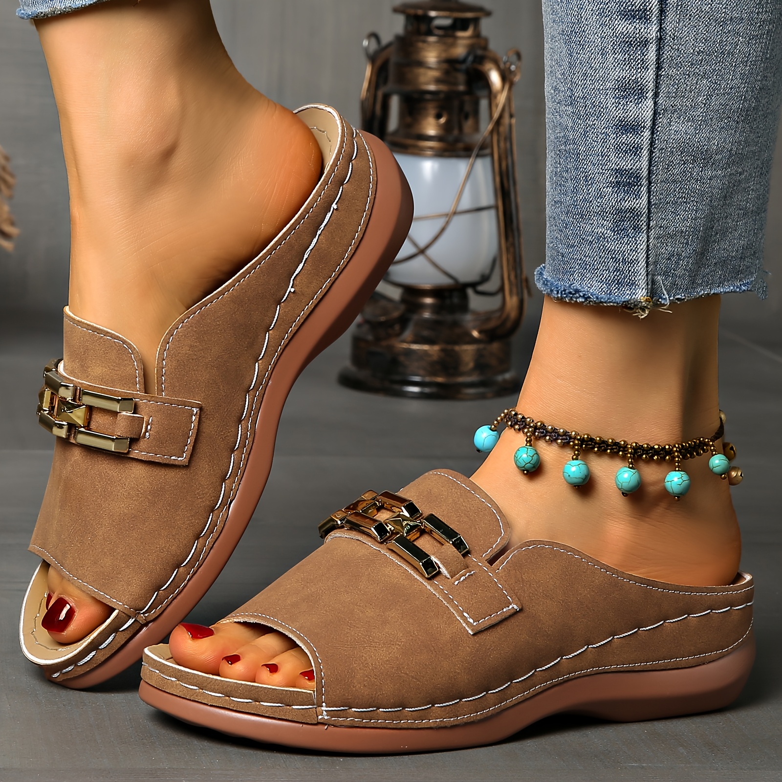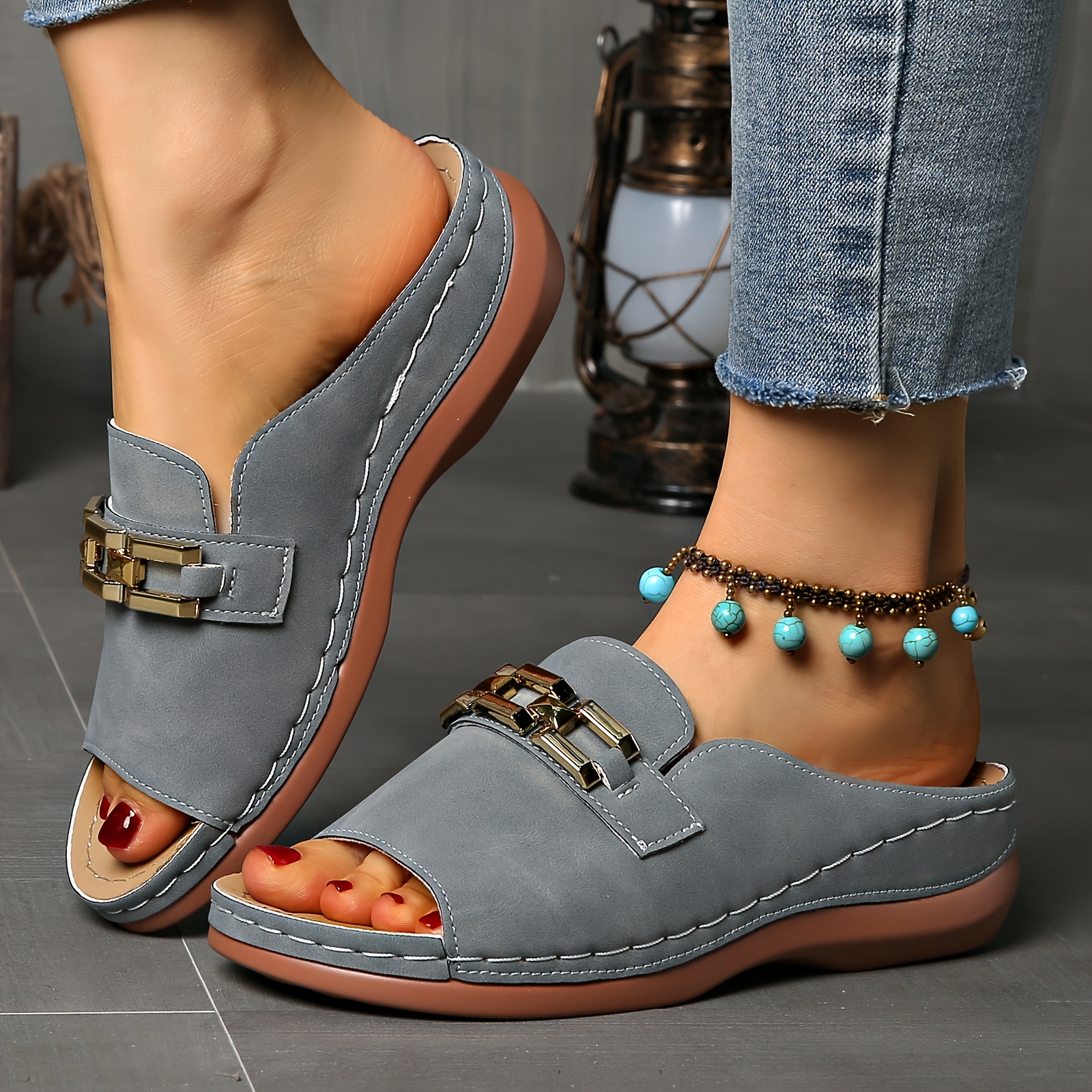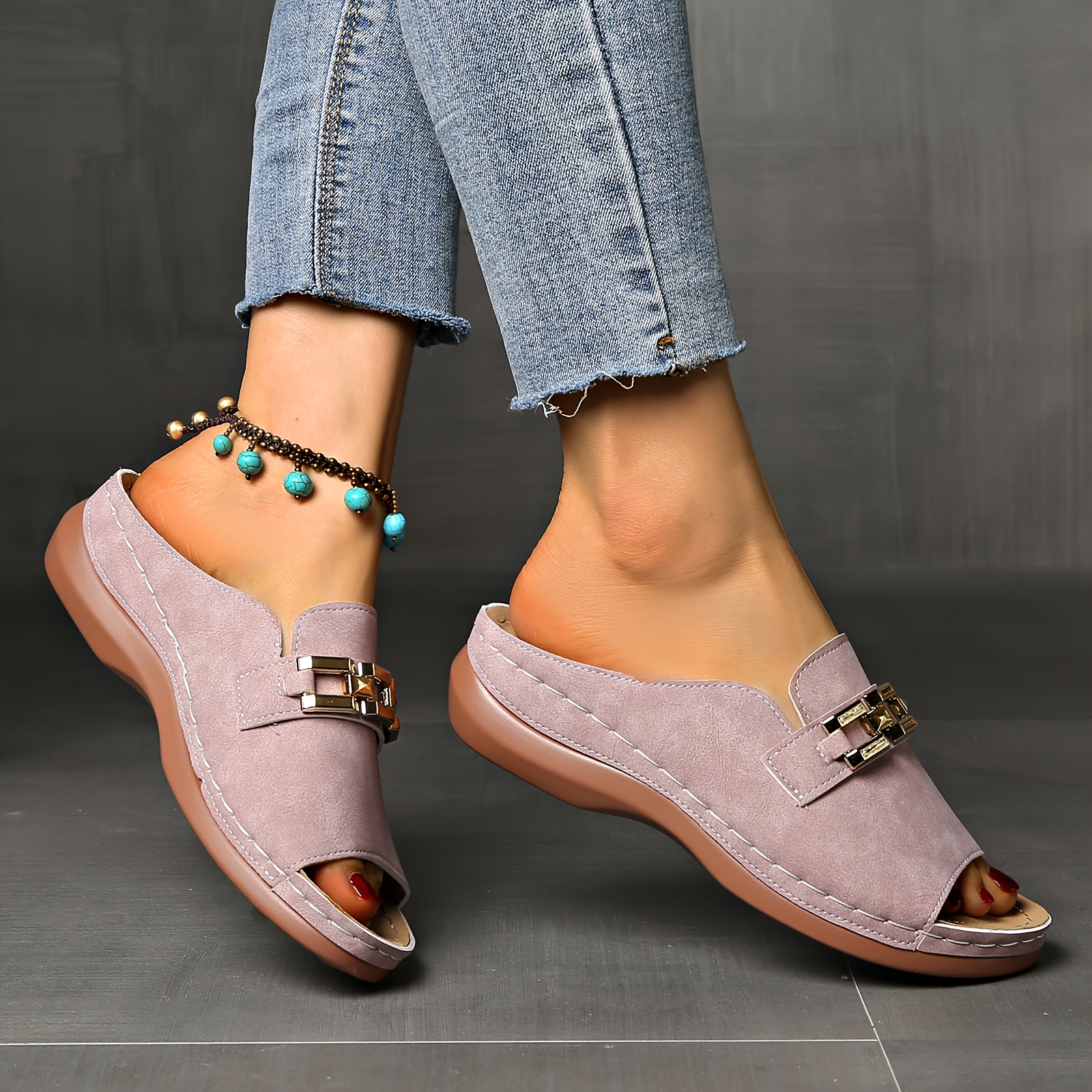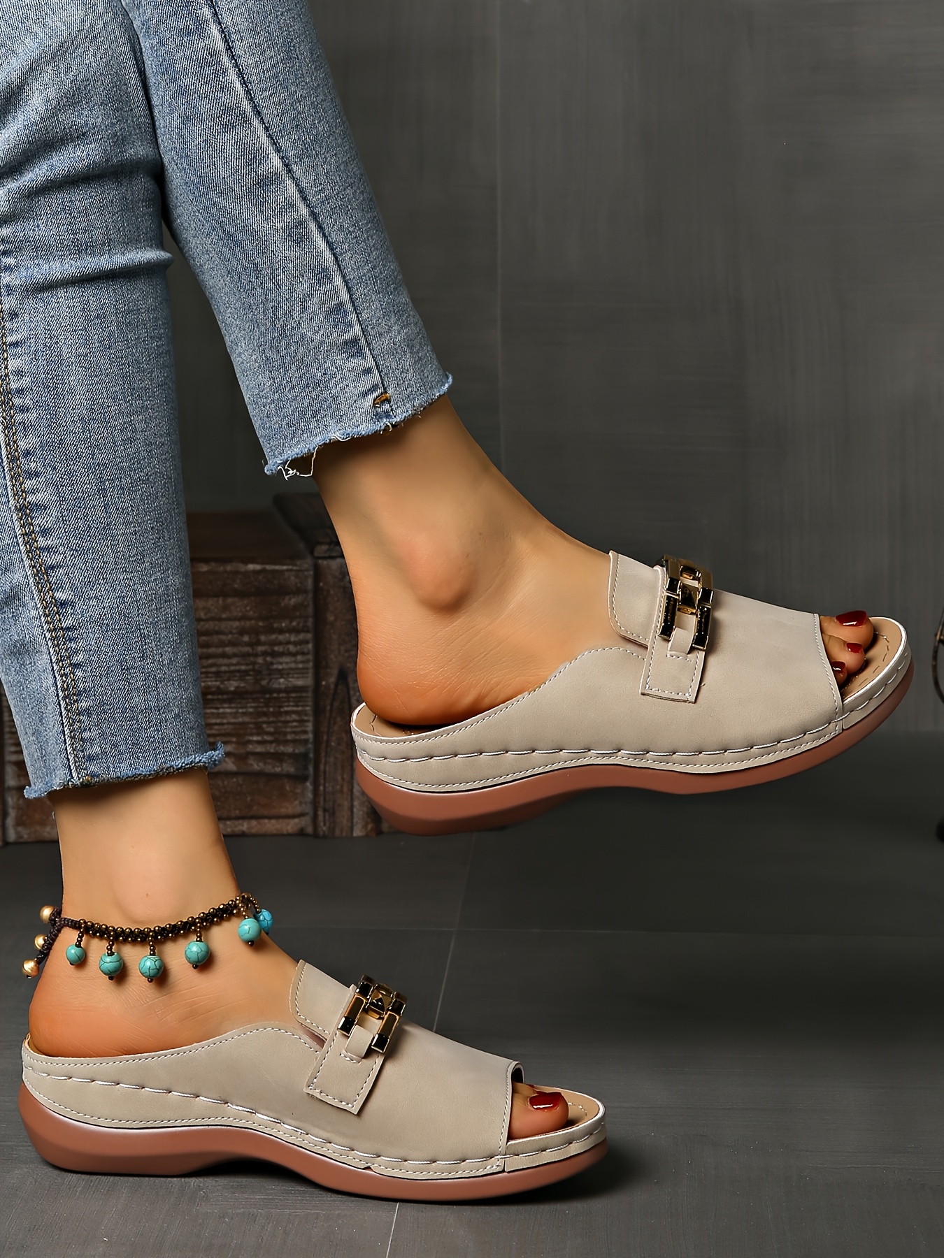 Sandálias femininas de verão com apoio para o arco - fivela dourada, biqueira ab
