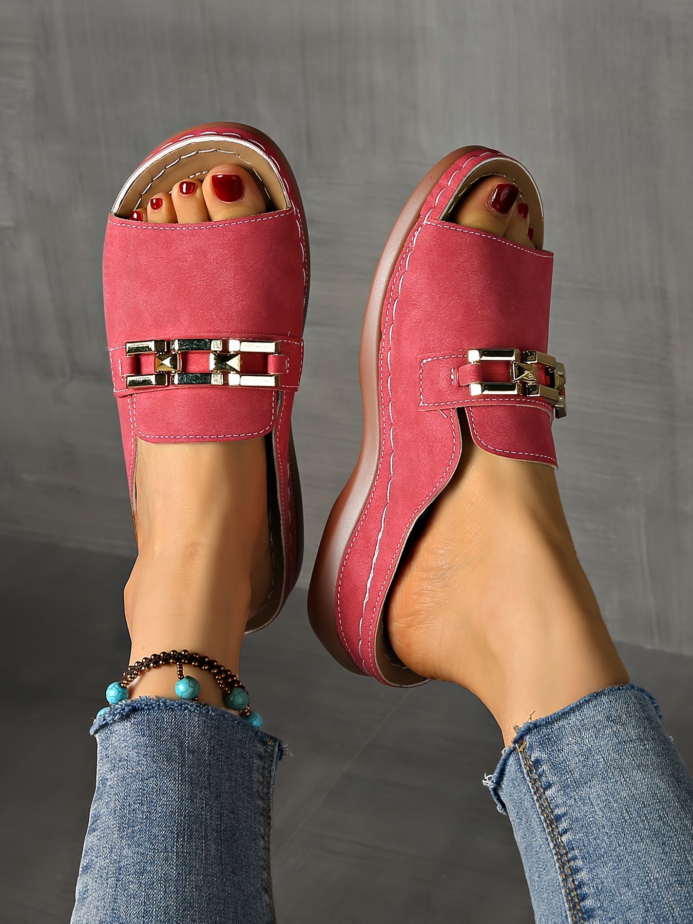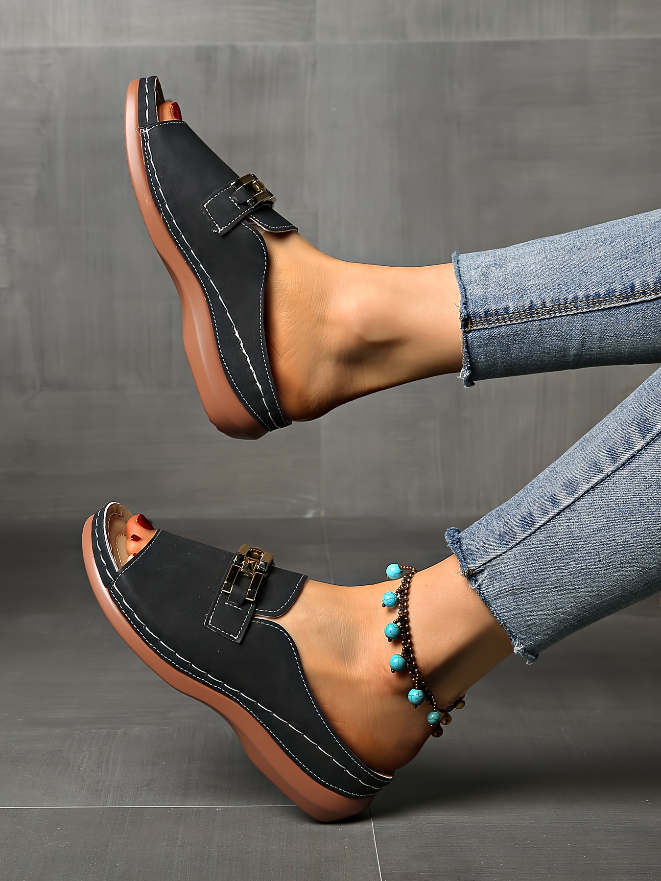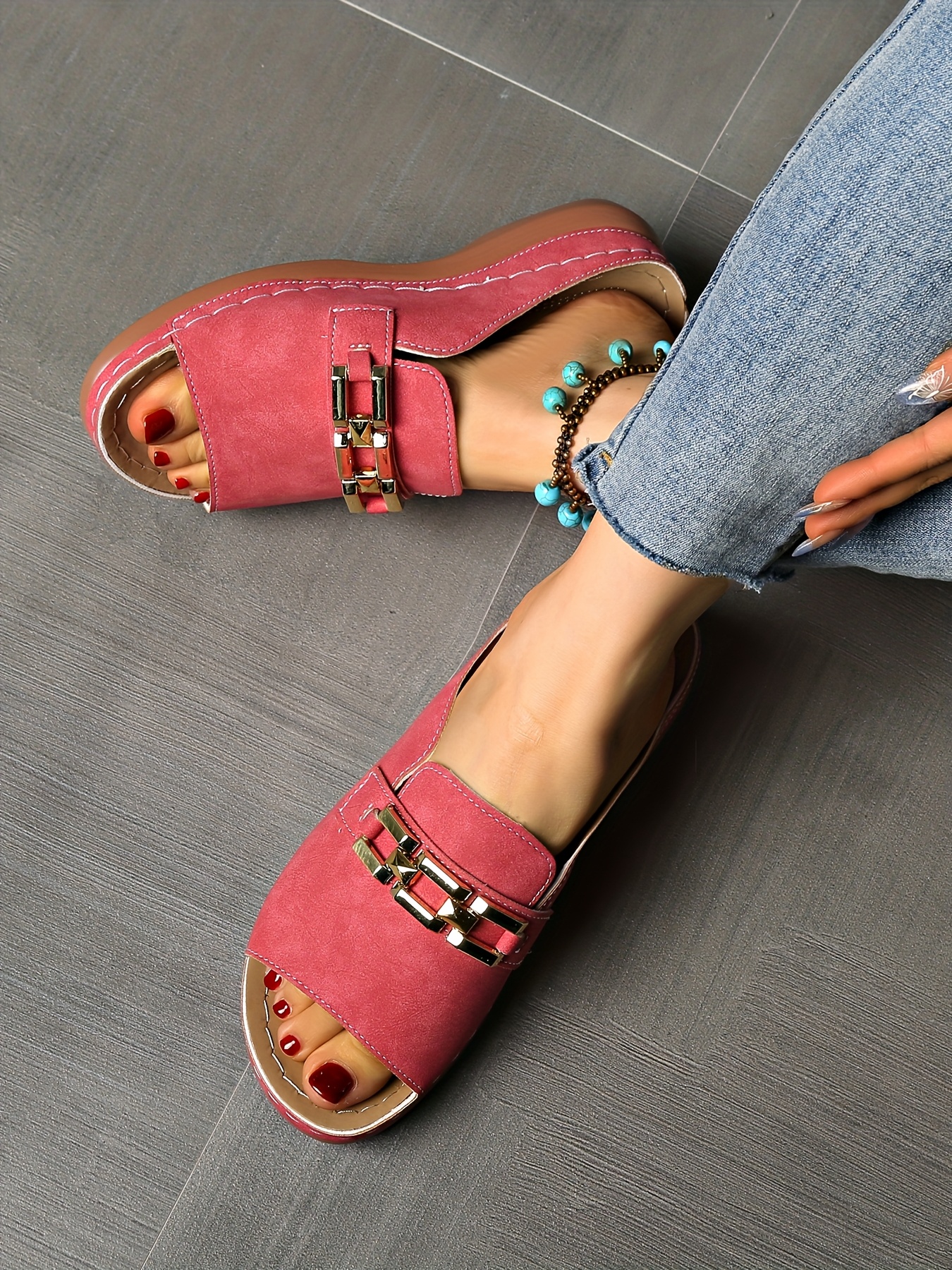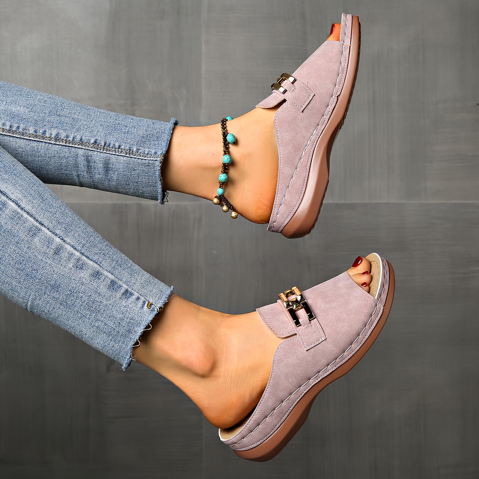 Sandálias femininas de verão com apoio para o arco - fivela dourada, biqueira ab